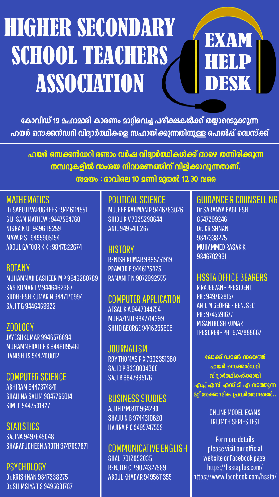 കോവിഡ് 19 മഹാമാരി കാരണം മാറ്റിവെച്ച പരീക്ഷകൾക്ക് തയ്യാറെടുക്കുന്ന ഹയർ സെക്കൻഡറി വിദ്യാർത്ഥികളെ സഹായിക്കുന്നതിനുള്ള ഹെൽപ്പ് ഡെസ്ക്.. ഹയർ സെക്കൻഡറി വിദ്യാർത്ഥികൾക്ക് തന്നിരിക്കുന്ന ഫോൺ നമ്പറുകളിൽ സംശയ നിവാരണത്തിന് വിളിക്കാവുന്നതാണ്. ഹയർ സെക്കൻഡറി ഒന്നാം വർഷ വിദ്യാർത്ഥികൾക്കുള്ള ഹെൽപ്പ് ഡെസ്ക് ഫോൺ നമ്പറുകൾ ഡൗൺലോഡ് ചെയ്യാൻ ഇവിടെ ക്ലിക്ക് ചെയ്യുക. ഹയർ സെക്കൻഡറി രണ്ടാം വർഷ വിദ്യാർത്ഥികൾക്കുള്ള ഹെൽപ്പ് ഡെസ്ക് ഫോൺ നമ്പറുകൾ ഡൗൺലോഡ് ചെയ്യാൻ ഇവിടെ ക്ലിക്ക് ചെയ്യുക